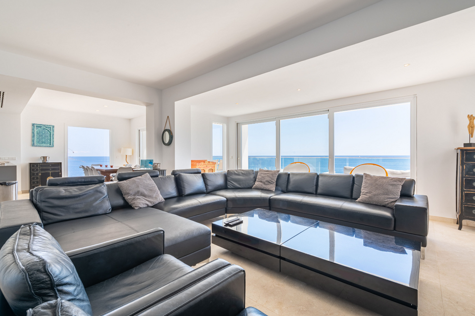 Al primo piano, il soggiorno di 50 m² con grandi vetrate e camino a gas offre una vista mozzafiato sul mare, mentre la cucina moderna e la zona pranzo si aprono su due terrazze, una coperta e l’altra accanto alla piscina con panorama sulla costa...